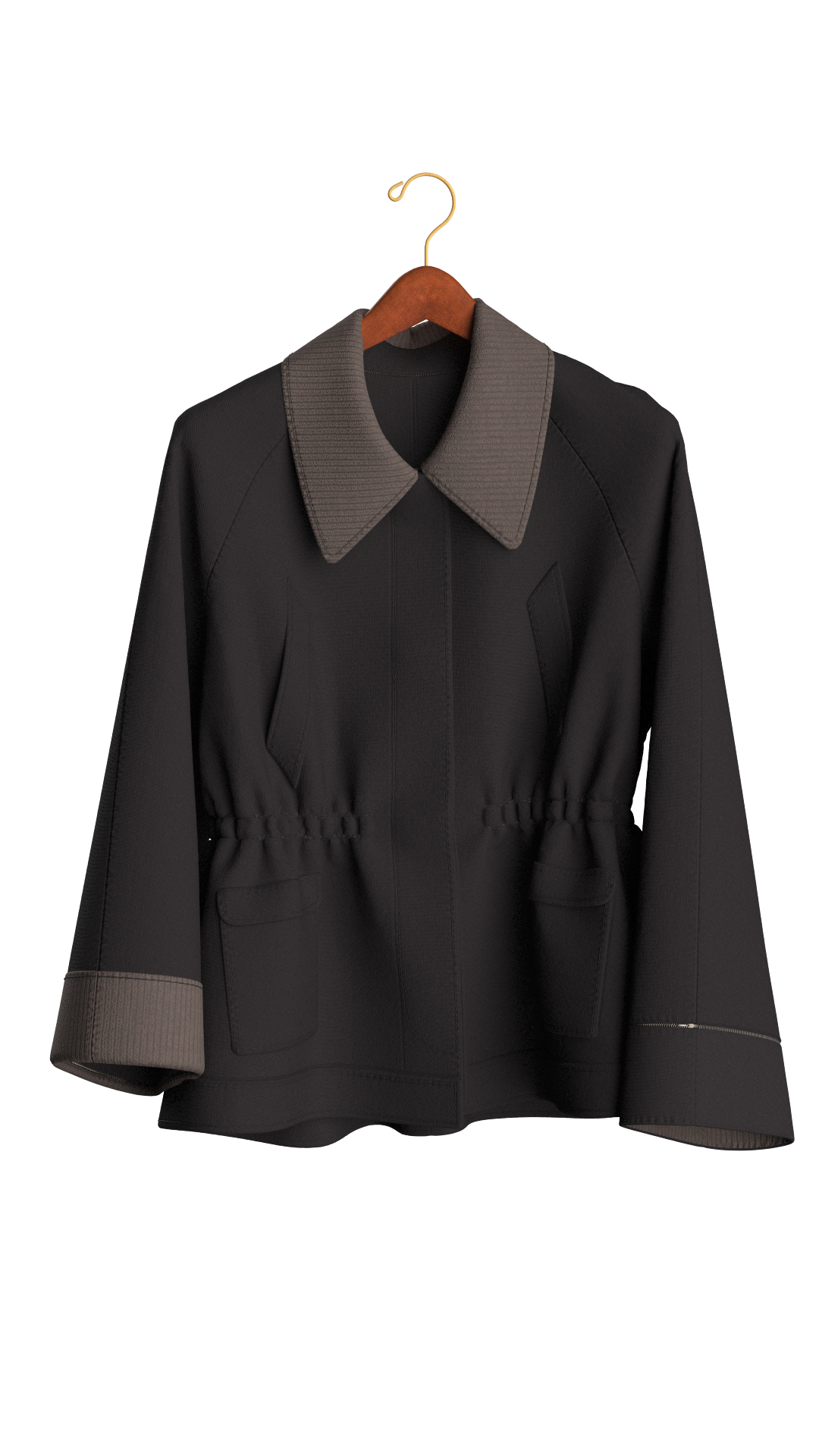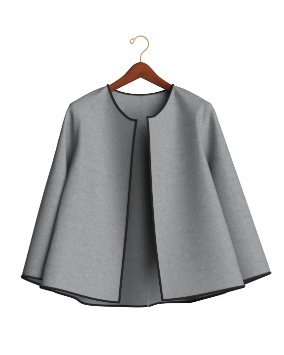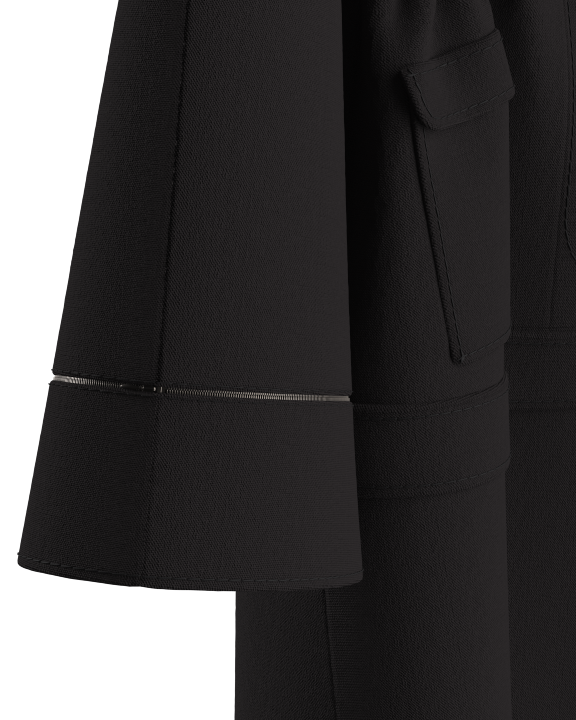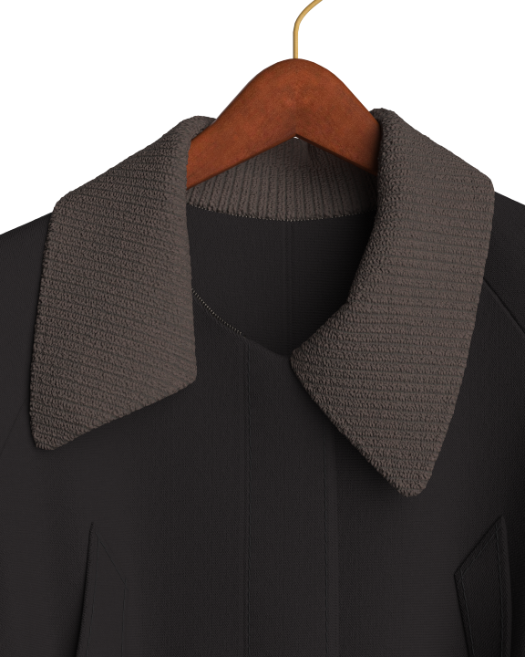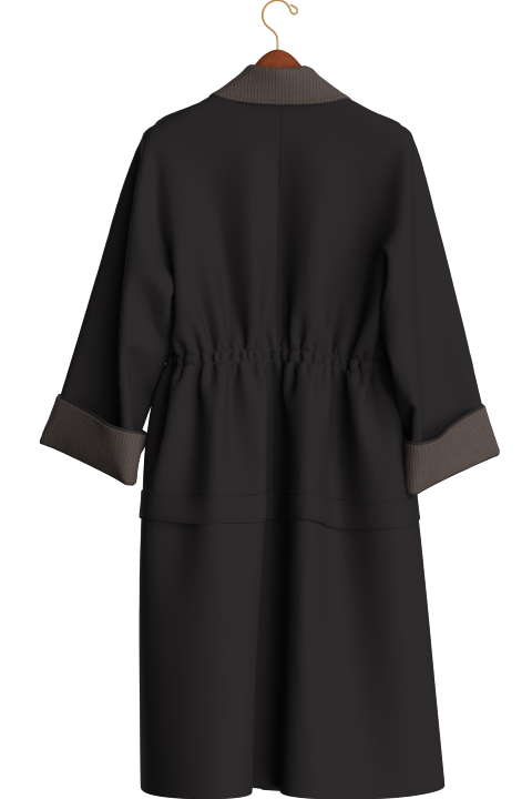 A modular coat concept developed in CLO3D, showing how 3D visualization can explore design variations: zip-off and snap-button elements, different collar options - all before any physical sampling.
